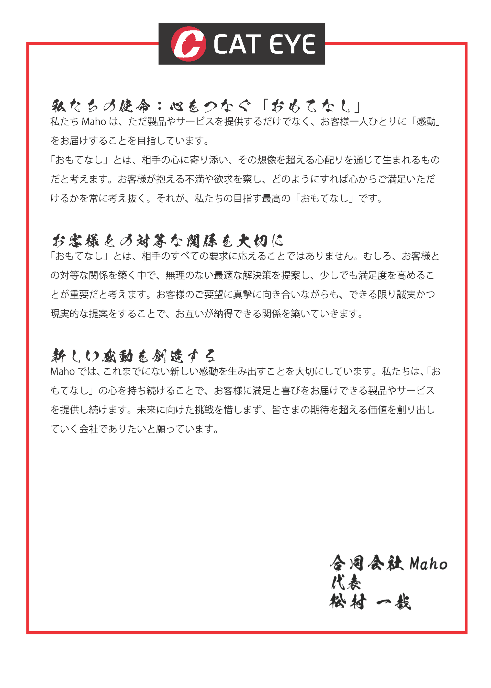 私たちMahoは、心をつなぐ『おもてなし』の精神で、感動と満足を創造し続けます。