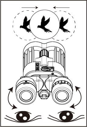 左右の円が重なって一つの円になったら開閉を止めます。眼幅調整をする時は、出来るだけ遠くの目標を見て行って下さい。また、両手で接眼レンズを持つ事で、スムーズな調整が可能になります。