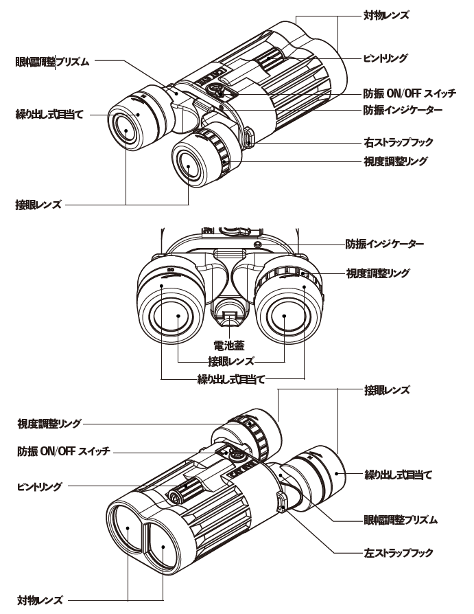 人はそれぞれ視力、目の位置などが違うので、使用する前に、双眼鏡の調整が必要です。