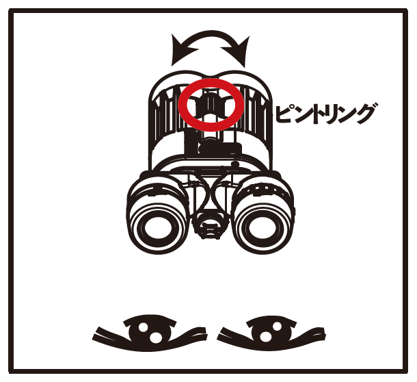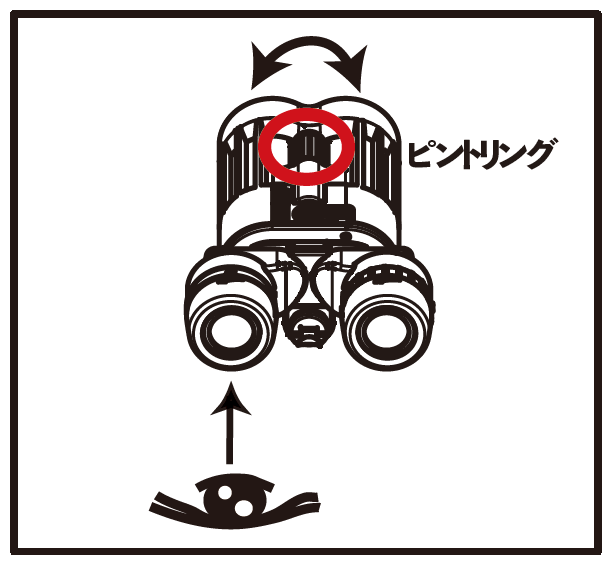視度調整を行います。左側の接眼レンズを左目で覗きながら、「ピントリング」を回して、目標物に正しくピントが合ったら止めます。出来る限り遠くの目標物を見て調整して下さい。