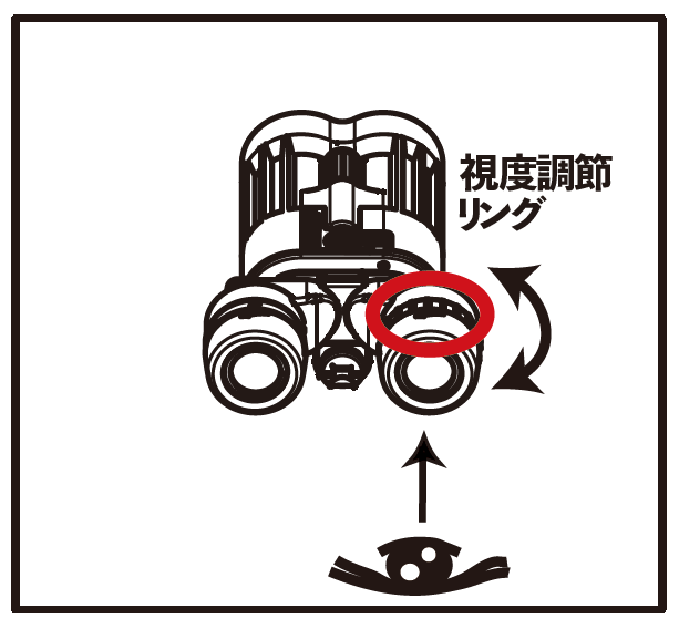 次に右目で右側の接眼レンズを覗きながら、右側の「視度調整リング」を回します。同じ目標物に正しくピントが合ったら回すのを止めます。
